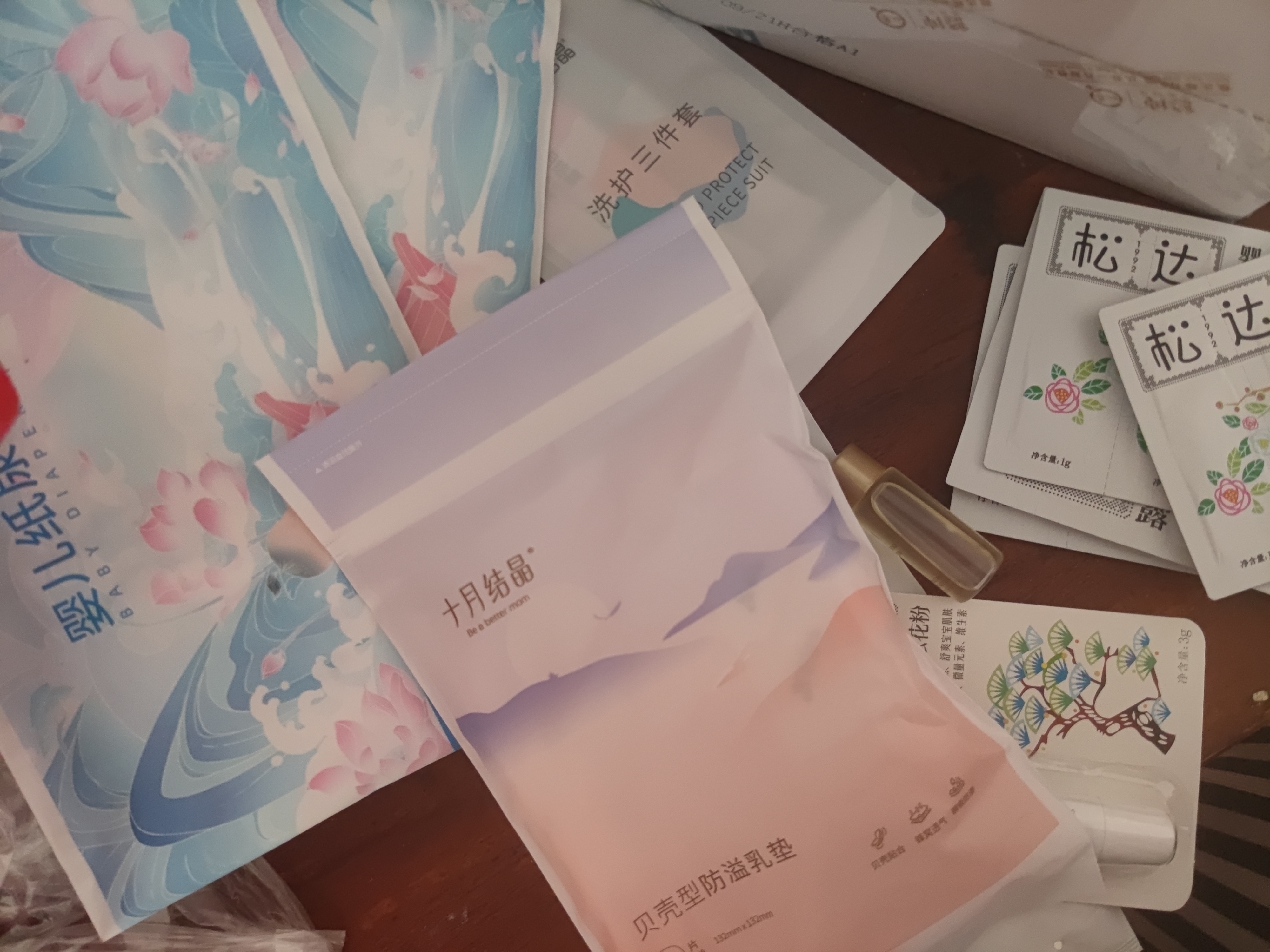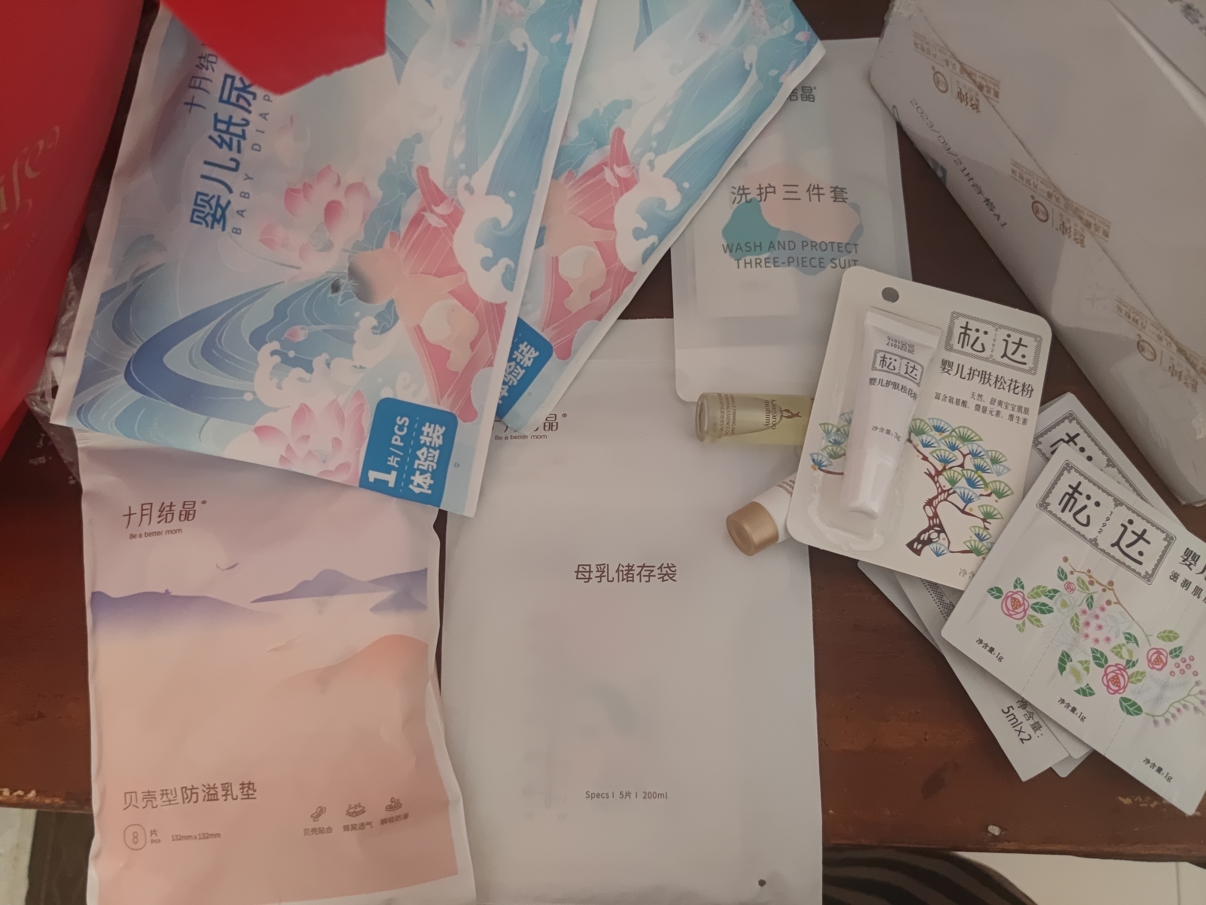 接下来的时间是坐等收快递了,拿到快递非常激动的哦。很多实用的东西,之前在某宝想买松达的护肤品,宝盒里有试用装,宝宝还出生,看评论很好用。待产包里没有准备防溢乳垫,宝盒里有8片十月结晶的,还有袋鼠妈妈的洗护用品,纸尿裤有2片小码的,是非常nice的。