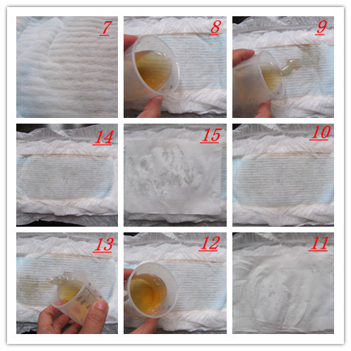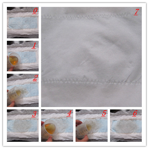 从上面的实验可以看到,两次40ml(即80ml)的液体全部快速被吸收了,并且尿裤的表面还是十分的干爽。