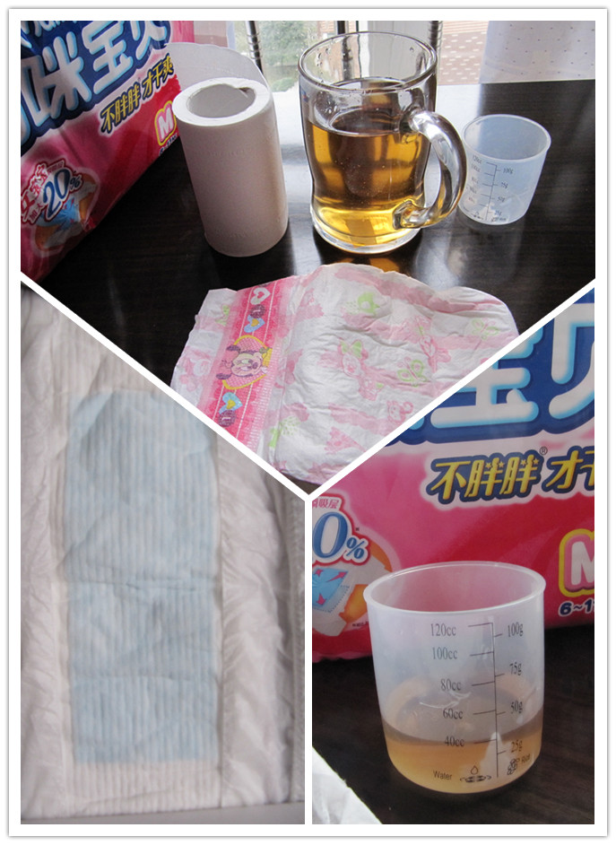 一张妈宝尿裤,一杯有色液体,量杯,纸巾。每次量取40ml液体模拟宝宝的尿尿,看看妈宝表现如何呢?