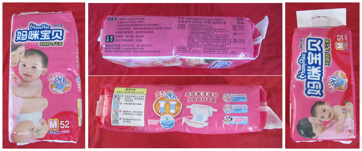 这次试用的是妈咪宝贝瞬吸干爽纸尿裤女宝M52。尤妮佳公司出品的,所以,我对妈宝的尿裤也很有好感。